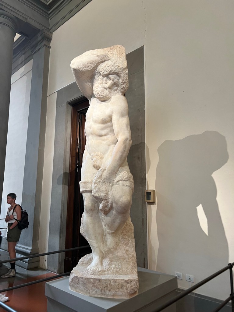 - Leading up to the Statue of David are the Four Slaves of Michelangelo. These are sculptures intentionally left unfinished. Michelangelo believed that his work spoke to him and allowed for him to “free” the person within the marble. They were originally sculpted to hold the tomb of the Pope, representation given sinners breaking free from the “prison” of sin.