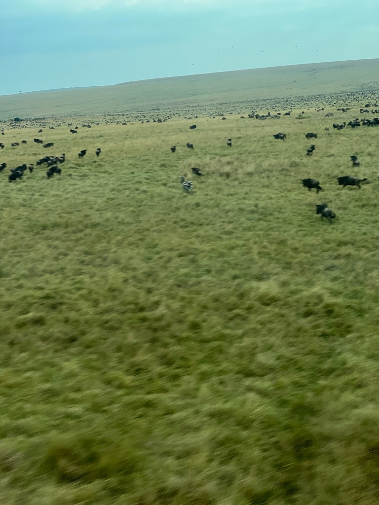 We were driving along, enjoying the insane amounts of wildebeest surrounding us. Our guide told us there are about 2 million animals that participate in the migration and half a million of those are wildebeest.